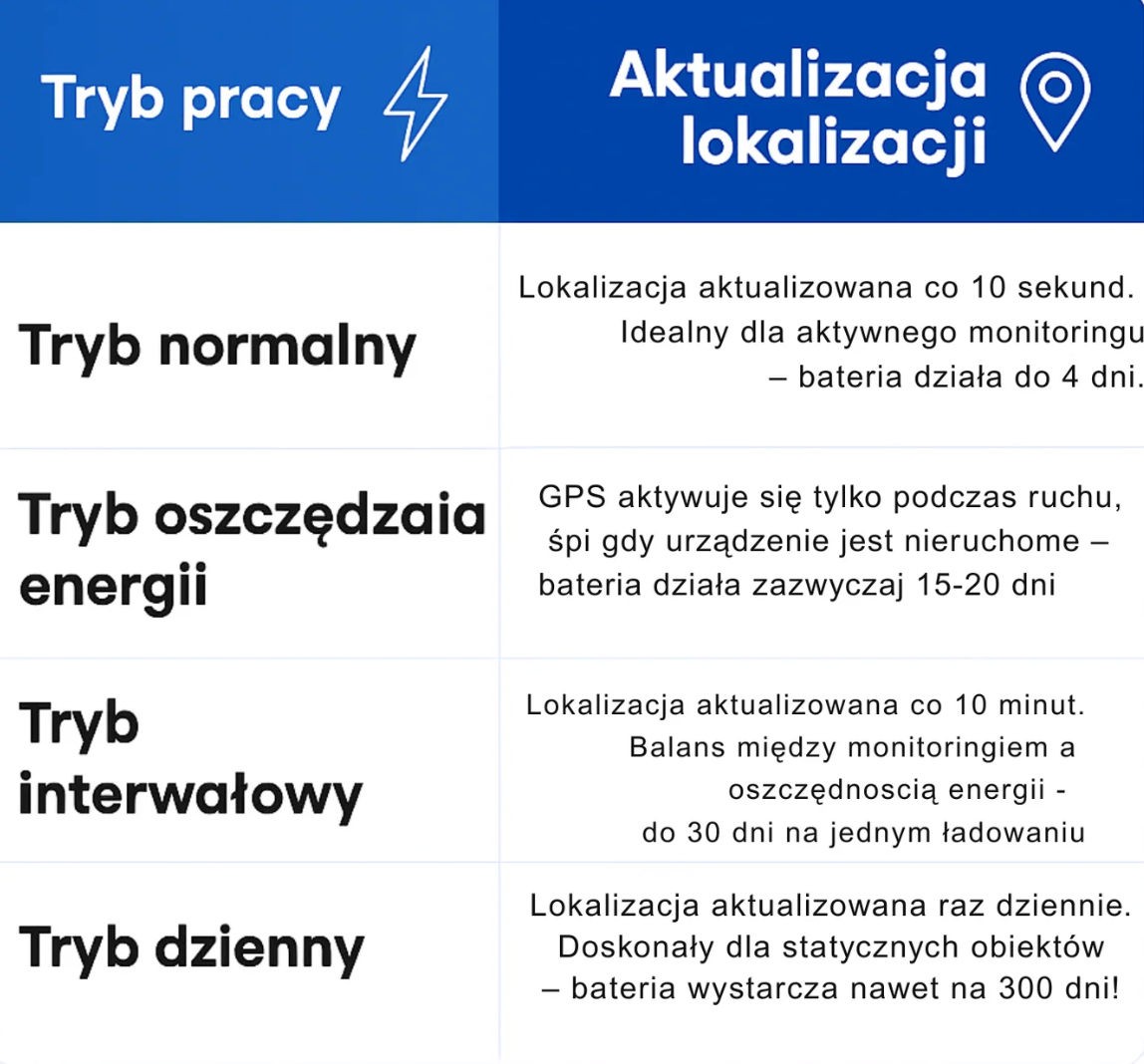 Lokalizator Locaro GPS Pro wyposażony jest w pojemną baterię 6000 mAh, która zapewnia długotrwałe działanie bez konieczności częstego ładowania. W zależności od wybranego trybu pracy możesz dopasować zużycie energii do swoich potrzeb: